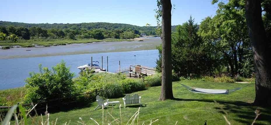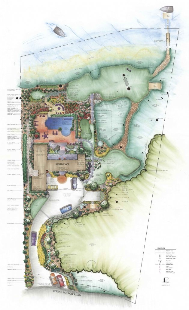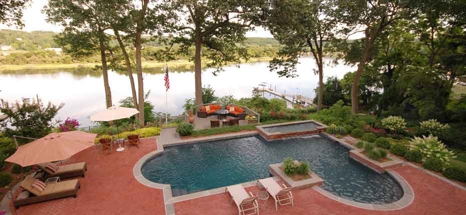 When our clients bought this waterfront residence it was virtually un-maintained for several years and needed a complete overhaul. Their wish list included making the steep and narrow driveway easier to navigate, creating inviting entertaining spaces, a putting green, a BBQ, removals of invasive plants, renovating the leaking gunite pool, extensive outdoor lighting, better dock access and storage space for recreation items.