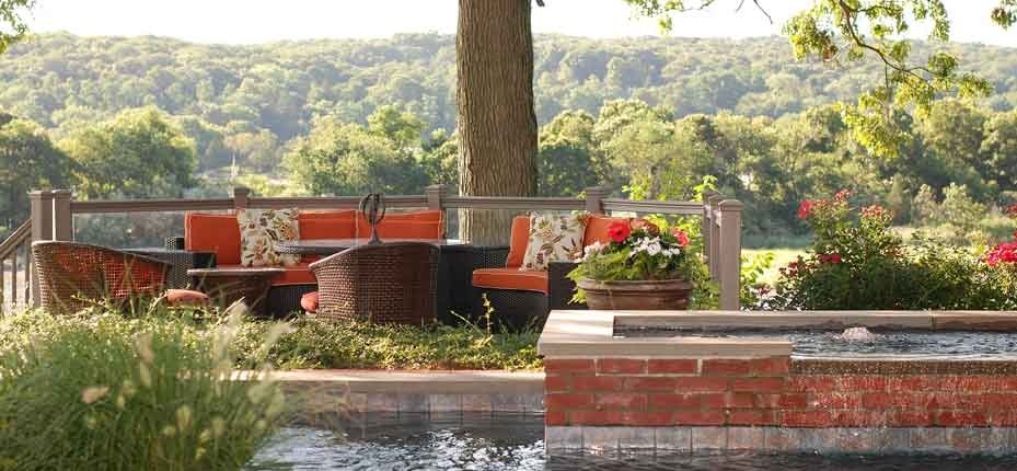A cozy putting green sits below the pool area. A large brick and bluestone patio surrounds the renovated gunite pool, complete with a new bluestone coping. We added a swim out to the deep end and converted the existing pond to a reservoir that spills into the pool, circulating the water. Random bricks break up the sheet of water into tranquil white noise.